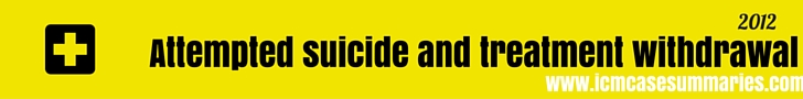 We were then able to wean him from sedation by day 11 of his admission. The patient’s ventilatory requirements were still high requiring mean airway pressures of 30 cmH2O, PEEP of 10 cmH2O, and an inspired oxygen concentration of 60%. At this stage he indicated to the ITU team that he did not wish treatment to be continued. We found him to be fully orientated in terms of time and place and he was aware of the preceding events and his intentional overdose. It was clearly explained to him that if treatment were discontinued he would die. He indicated to us that he had no intention of changing his mind.